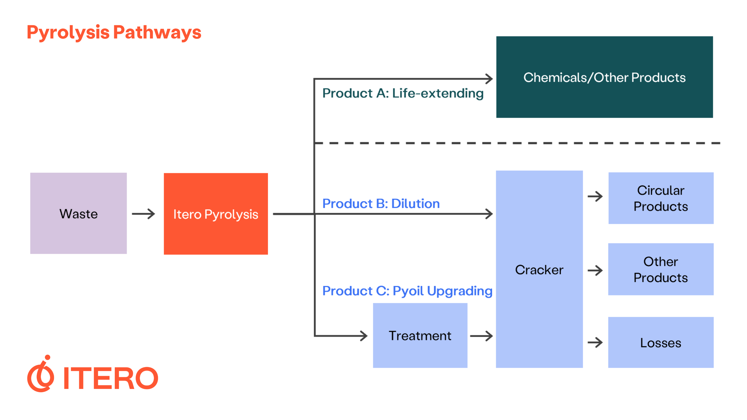 At Itero, we focus on the greatest possible circularity, rather than pathways to life-extending solutions, where plastics are recycled into products that have limited recycling possibilities. We therefore focus on the formulation of circular polymer products – this is through either ‘dilution’, or ‘treatment’. Dilution is where our pyrolysis oil product is fed directly into a naphtha cracker and is mixed with fossil-derived oils before it is transformed into new plastics. Treatment, or upgrading, is where pyrolysis oil is treated to improve its quality by removing waste-based contaminants before being cracked and made into new products. Due to the scale of crackers and the supply of pyrolysis oil, treated oils will still be mixed with fossil oils upon entry to the cracker. Via dilution, however, the oils are mixed without upgrading and the contaminants are 'diluted' to reasonable levels. Dilution is therefore limited to a low pyrolysis oil to fossil oil ratio, making it a limited solution as pyrolysis oil stocks and demand increase, while upgrading gives greater scalability into the future. At present, with the small supply of pyrolysis oil and the development of upgrading infrastructure, dilution is needed in many cases. We believe the future is in upgrading, and so this is our focus.